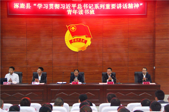2016年5月4日,团县委组织的涿鹿县“学习贯彻习近平总书记系列重要讲话精神”青年读书班在涿鹿中学报告厅隆重开班。涿鹿县委副书记张志刚、县委常委刘宾、团县委书记马大伟、副书记刘晓旭、王大成、办公室主任刘鹏出席活动。涿鹿县大学生村官、县直机关、企业、社会组织、农村青年致富带头人、中小学学生等230多位优秀青年代表参加活动。涿鹿中学校长赵建华、副校长孟庆泉、杨景丹、校团委书记郭冬根、团委王佰成老师及15名优秀学生代表参加了此次读书班的培训。
