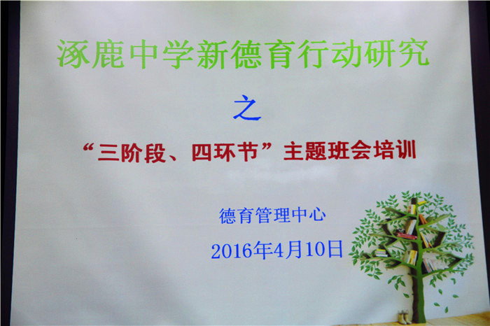 主题班会是指有鲜明主题的、以班集体为单位、以素质教育为根本目标的教育活动。主题班会是班主任工作有效的途径和形式之一,是教育学生、学生自我教育和增强班级凝聚力的有效手段,在教育学生和管理班级中发挥着十分重要的作用。根据涿鹿中学新德育实施方案的安排,涿鹿中学全体班主任于4月10日晚在第一报告厅召开了新德育的第二次培训会,培训主题为“三阶段四环节”主题班会培训会。