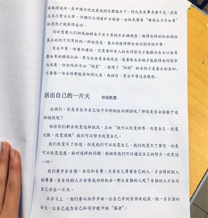 因班级女生较多,所以第一期班刊以“做自立自强的女生”为主题。在班主任温晓敏老师的指导下,韩梦凡、曹妍和赵印杰三位同学组成编委会,策划、筹备本次班刊。学生们兴趣高昂,积极投稿。近日,名为《逆行之路》的高一(7)班班刊正式出版创立。