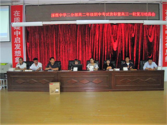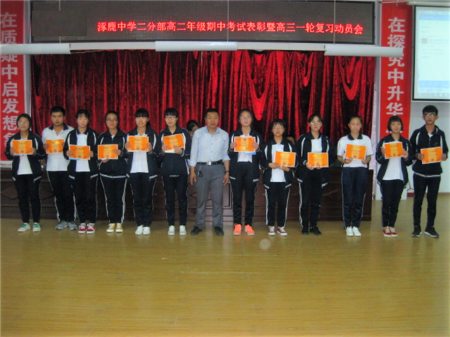 为了表彰在期中考试中获得优异成绩的学生,以榜样引导学生发展,抓紧一轮复习,努力学习,提升成绩,涿鹿中学二分部隆重召开“期中考试表彰会暨高三一轮复习动员大会”。参加本次表彰会的有二分部主管校长赵文成、二分部级部主任何利以及全体班主任老师。本次表彰会由二分部高二级部主任何利主持。