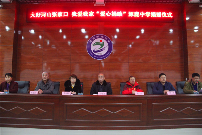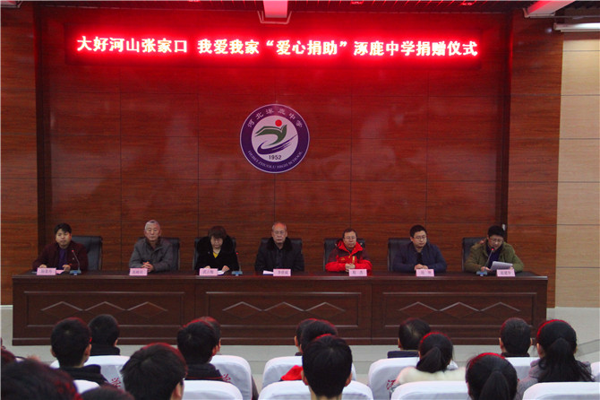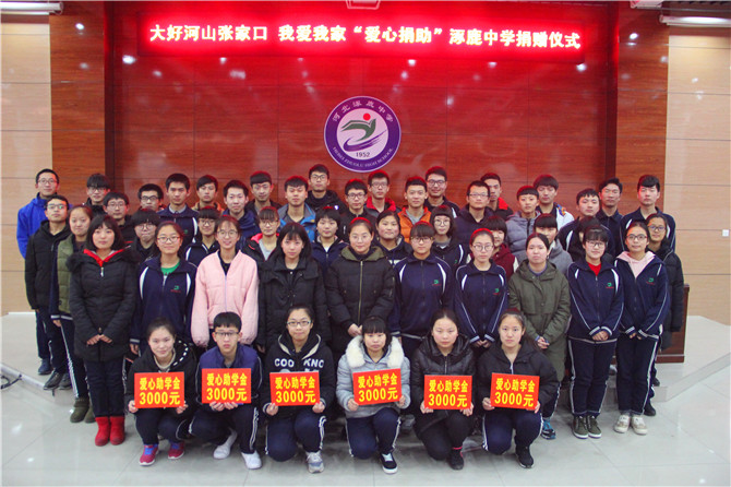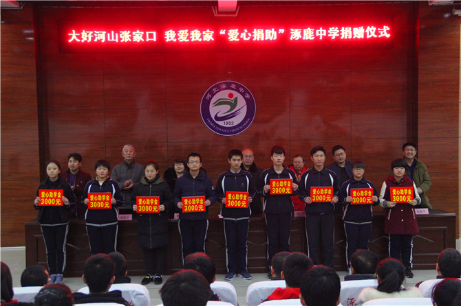 大爱无疆,情系教育,2018年1月25日上午,大好河山张家口•我爱我家慈善公益基金“爱心捐助”仪式在涿鹿中学隆重举行。市政协教科文卫体委员会副主任李世成、涿鹿县政协副主席武占梅、县政协秘书长程杰、县教科局副局长高峰河、北大青鸟公司经理刘坤、涿鹿中学校长赵建华、副校长杨景丹、各级部主任和受捐助的50名同学共同参加捐助仪式。县政协副主席武占梅主持捐助仪式。