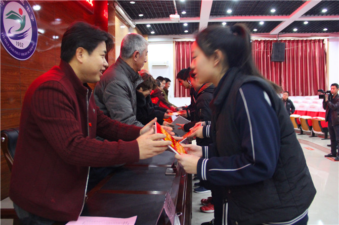 杨景丹副校长宣读了涿鹿中学受资助学生名单。在欢快的颁奖乐曲中,与会领导向受资助学生发放爱心资助,并合影留念。