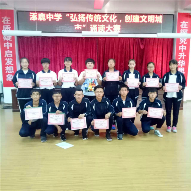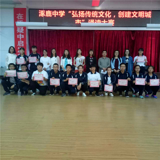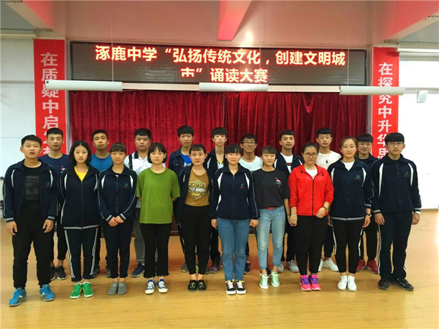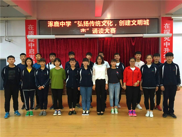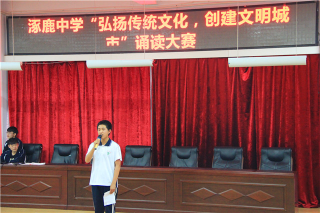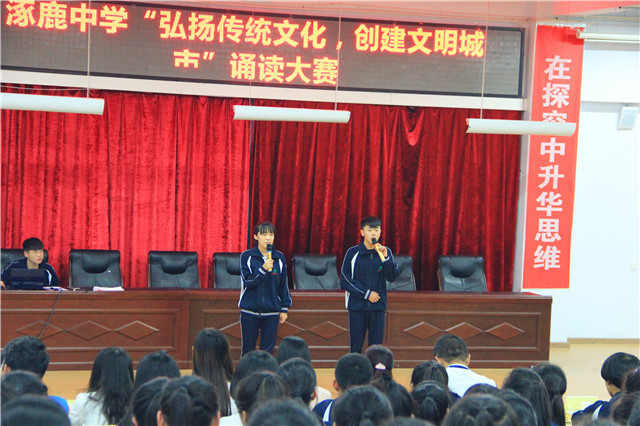 为配合涿鹿县省级文明城市创建工作,扎实推进社会公德、职业道德、家庭美德建设,提高学生个人思想品德,5月12日下午,涿鹿中学教科处联合校团委、语文中心教研组、信息中心在学生报告厅举办了“弘扬传统文化创建文明城市”朗诵比赛。教科局高中教研室张舒军主任、朱丽兰副主任、唐文辉老师、涿鹿中学校领导赵建华、何晓乐现场与同学们共同观看了比赛。 选手们精选优秀文学作品,把培育和践行社会主义核心价值观与继承弘扬中华优秀传统文化结合起来,用饱满的激情和震撼的情感将文明、礼让、诚信、宽容等优秀传统文化的美韵与精髓传递给在场的每一位师生。选手精彩的朗诵赢得现场师生热烈的掌声,比赛现场气氛热烈、欢快祥和。三位校园十大歌手的倾情演唱,更是让现场观众热情高涨。朗诵比赛取得圆满成功。 本次活动将校园文明建设、学生品德培养有机融入文明城市创建工作中,让“美德是立身之本,文明是城市之魂”的理念深入同学们的心中,让文化涵养城市发展,滋养校园生活,让同学们在参与、学习、体验中感受传统文化的魅力,提升自身文化品味。 涿鹿中学 范雪菊 翁智