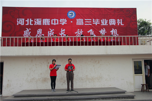 六月的校园生机盎然,六月的校园激情涌动。伴随着成长的喜悦,洋溢着收获的激动,2017年6月2日上午,涿鹿中学隆重举行“感恩成长,放飞梦想”2017届高三年级毕业典礼。涿鹿中学校领导与高三全体师生1100多人参加了毕业典礼。杨景丹副校长主持本次毕业典礼。 毕业典礼在庄严的国歌声中拉开序幕。伴随着轻柔的钢琴曲,马智勇、张雪老师用诗朗诵《祝福》向全体高三同学送上最真诚的祝福。教师代表谭丽娜老师代表全体辛勤耕耘的教师祝愿涿中学子决胜六月,圆梦涿中! 毕业典礼上,毕业生代表向三年来辛勤奉献、可亲可敬的老师献上鲜花,并深深地鞠躬,表达同学们对老师谆谆教诲、辛勤付出的感激。这一刻,掌声如潮水般涌动,感动的泪珠挂满了师生的脸颊。优秀毕业生代表郝颐同学代表全体高三学子向母校献上了真诚的祝福,并表达了全体高三学子拼搏的决心和必胜的自信。 毕业既是同学们人生一段经历的结束,又是新的人生之路的开始,梦想与脚步永远同行!毕业典礼上,同学们通过“我与涿中十年约定”和“为母校留言”活动,表达了自己对母校的热爱与眷恋。学子永远与母校共存,青春与梦想永远与母校相连! 最后,赵建华校长发表了热情洋溢的演讲。他代表学校祝贺高三学子圆满完成高中学业,同时也为他们即将步入高考考场而壮行。他希望即将走上新的人生旅途的同学们要规划好自己的人生,要勇于担当,要修身笃行,希望同学们扬帆起航,胜在高考,赢在未来! 今朝聚会筹宏业,明日辉煌耀涿中!整个毕业典礼在严肃、热烈、真诚、感恩的气氛中进行,同学们从毕业典礼中进一步感受到学校、老师的爱,并将带着师长的嘱托,带着与母校的约定扬帆远航,在高考中挑战自我,争创佳绩!在未来的岁月里挥斥方遒,大展宏图! 涿鹿中学宣传中心 孟庆泉 郭庆全