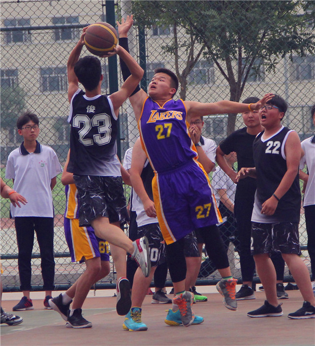 高一年级组和高二年级组的比赛在2块场地同时开打。赛场上,运动员们攻防有序,快捷凌厉,时而三分远投,时而篮下突破,时而抢断逆转,精彩纷呈,激起了场外观众一阵阵的呐喊声、鼓掌声、加油声。