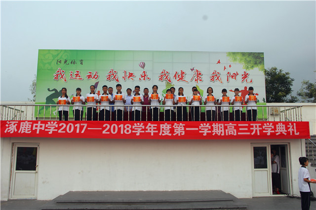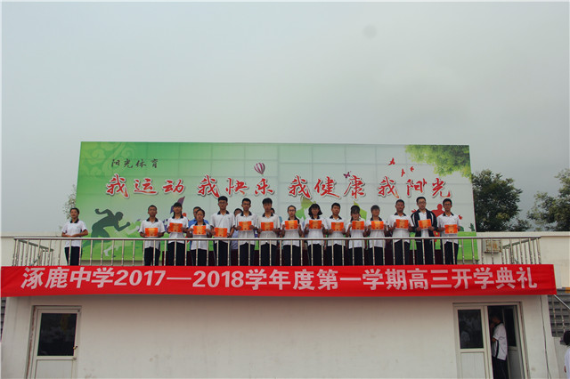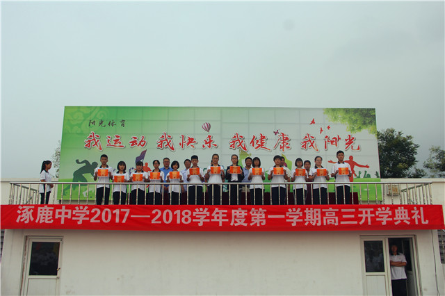 新学年、新希望、新业绩,2017年8月18日清晨,涿鹿中学校领导和高三年级1000余名师生齐聚运动场,隆重举行高三年级2017—2018学年度第一学期开学典礼。校领导赵建华、张成、杨景丹、闫慧武、赵文成、许楠楠出席,杨景丹副校长主持开学典礼。 杨景丹副校长主持开学典礼 张成副校长宣读表彰学生名单 鲜艳的五星红旗冉冉升起,嘹亮的国歌响彻校园,涿鹿中学高三年级开学典礼正式开始。张成副校长首先宣读期末统考表彰名单,校领导向获得表彰的优秀同学颁发奖状,并合影留念。 优秀学生代表高三13班刘婷婷同学表达了全体高三同学努力学习、高考必胜的坚定心声。教师代表马智勇老师、家长代表程亚峰女士分别致词,表达了教师、家长对高三学子复习备考的希望、要求和鼓励。 赵建华校长做动员讲话 赵建华校长在动员讲话中希望全体高三师生珍惜好、利用好高三时光,以明确的人生目标、扎实的知识基础、良好的学习习惯、坚定的信念信心,向管理要成绩,向态度和习惯要成绩,向规范严谨要成绩,向心理素质要成绩,师生携手,挥洒汗水,辛勤耕耘,播种希望,实现自我,创造新的辉煌! 高三年级开学典礼在全体师生面对国旗的庄严宣誓中胜利闭幕。 饱满的精神,激昂的誓言,彰显了全体高三师生刻苦拼搏、超越梦想、决胜高考的信心与决心。涿鹿中学高三全体师生将弘壮志、树新风,用自信的豪情化作利剑,扫除求学途中的重重障碍,构建涿中和谐校园,谱写涿中美好灿烂的明天! 涿鹿中学宣传中心 孟庆泉 郭庆全