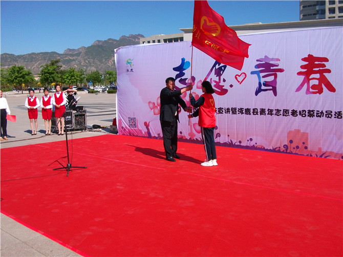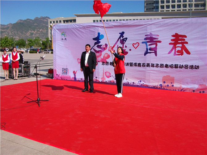 我校许硕同学作为接旗手代表我县志愿者从杨部长手里接过了涿鹿县青年志愿者的红旗。同学们认真聆听了我县优秀志愿者的先进事迹。
