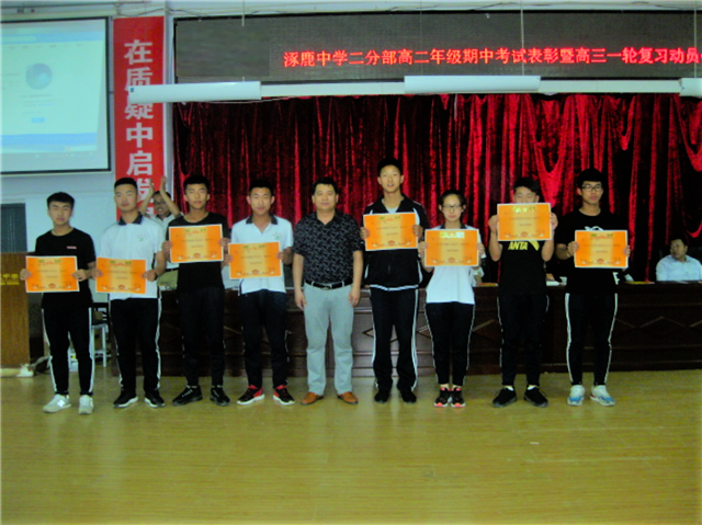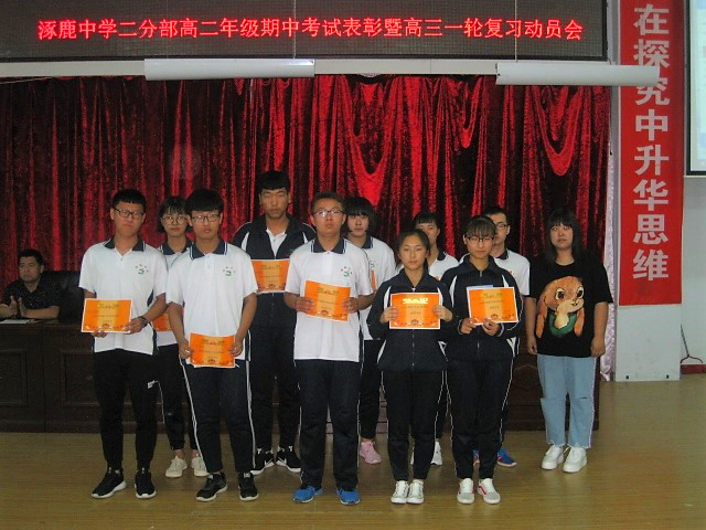 为了表彰在期中考试中获得优异成绩的学生,以榜样引导学生发展,抓紧一轮复习,努力学习,提升成绩,涿鹿中学二分部隆重召开“期中考试表彰会暨高三一轮复习动员大会”。参加本次表彰会的有二分部主管校长赵文成、二分部级部主任何利以及全体班主任老师。本次表彰会由二分部高二级部主任何利主持。