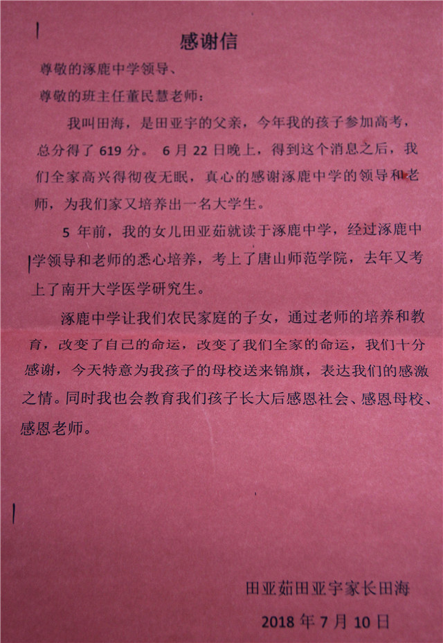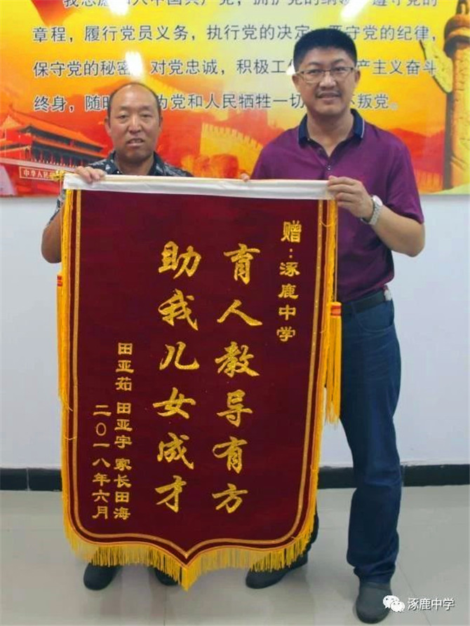 田海先生的女儿田亚茹2013年毕业于涿鹿中学,现在南开大学攻读医学硕士,儿子田亚宇2018年以619分成绩报考山东大学,实现了人生命运的转变。为表达感激之情,田海先生和儿子田亚宇向涿鹿中学赠送了这面锦旗。